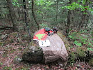 After a 50 minute hike we arrive at the summit and search for a suitable spot. I chose to install my telescopic pole on a windy section beside the trail on a dead tree and there is just enough clear space around for the antenna wire to come down without touching the branches.