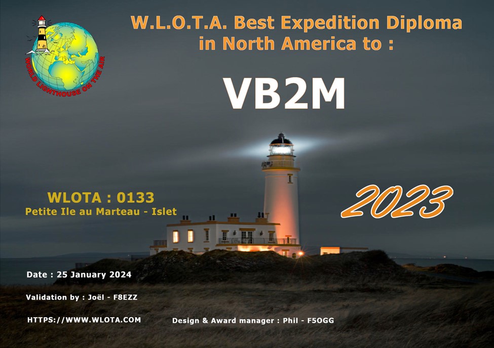 Merci à tous ceux qui ont contacté la station VB2M du 21 au 30 juillet 2023, que ce soit pour ajouter CQ Zone 2, IOTA NA-176, ARLS CAN 375, WL 0133, WAFF VEFF-0056, POTA VE-0056 dans leur log ou simplement pour échanger avec les membres de l’équipe!